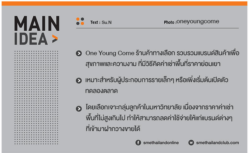 ด้วยเหตุนี้ จุลพงษ์ ทองธนรักษ์ ชายหนุ่มผู้สนใจการดูแลสุขภาพ จึงได้คิดรูปแบบโมเดลร้านค้าทางเลือกรับฝากวางจำหน่ายสินค้าเพื่อสุขภาพและความงามขึ้นมา เพื่อเวทีเล็กๆ ให้กับผู้ประกอบการให้สามารถเริ่มต้นธุรกิจ เปิดตัว ทดลองตลาดได้โดยไม่ต้องใช้เงินทุนสูงมากนัก ขณะเดียวกันก็เป็นทางเลือกให้กับผู้บริโภคได้บริโภคสินค้าดีมีคุณภาพในราคาที่ไม่แพงด้วย โดยใช้ชื่อว่า One Young Come (วันยังค่ำ)
