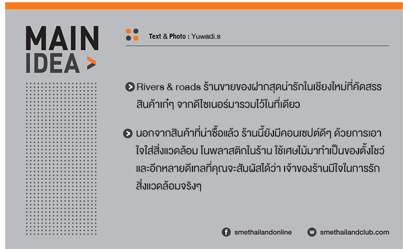 บี๋: “เราคิดว่าอยากให้มีร้าน Souvenir ในเชียงใหม่ที่แตกต่าง ไม่เหมือนกับคนอื่นและเราอยากที่จะนำเสนอศักยภาพของดีไซเนอร์ ศิลปินในเชียงใหม่ด้วย เราเลยเป็น Selected Shop ที่คัดเลือกงานจากศิลปินต่างๆ มารวมไว้ เราคิดว่าคนที่มาเที่ยวเชียงใหม่เป็นเพื่อนเรา จิ๊กกี๋คิดชื่อร้านได้จากเพลง rivers & roads พูดถึงเพื่อนที่ห่างหายไป ไม่เจอกันนาน เราก็อยากให้คนมาเที่ยวเชียงใหม่คิดถึงเรา ประกอบกับว่าร้านเราอยู่ถนนเส้นที่แม่น้ำปิงตัดกับท่าแพพอดี เลยกลายเป็น rivers & roads นอกจากนี้เราทั้ง 4 คนมีความเห็นตรงกันว่าพลาสติกมันเริ่มมากไปแล้วในเชียงใหม่ เราอยากลดการใช้พลาสติก คอนเซ็ปต์ร้านเราคือจะไม่ใช้ถุงพลาสติกกันเลยในร้าน”