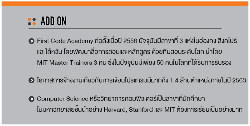 ในเรื่องนี้ Fung Ying Lam City Operations Manager ของแบรนด์ First Code Academy สถาบันสอนการโค้ดสำหรับเด็กที่ใหญ่ที่สุดในเอเชียจากฮ่องกง บอกว่า ทางสถาบันมีความมุ่งมั่นที่จะสอนเด็กๆ ให้เรียนรู้เรื่องของการโค้ดดิ้ง (Coding) คือ การเขียนโค้ดด้วยภาษาคอมพิวเตอร์ หรือการเขียนโปรแกรมคอมพิวเตอร์นั่นเอง เพื่อตอบสนองต่อการเปลี่ยนแปลงของโลกเทคโนโลยีในปัจจุบัน
