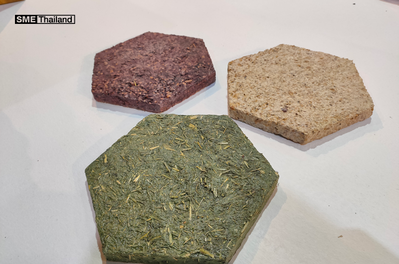 “ที่ผ่านมาเชียงใหม่เราถูกส่งเสริมให้มีการปลูกกาแฟ อีกทั้งประเทศไทยยังมีการส่งออกกาแฟสูงถึง 300 ตันต่อปี ขณะที่ความต้องการของผู้บริโภคในประเทศก็มีมากถึง 700 ตันต่อปี จึงส่งผลให้มีกะลากาแฟถูกทิ้งทุกวัน ซึ่งกะลากาแฟนั้นเป็นวัสดุเหลือใช้ที่ย่อยสลายได้ยาก เราจึงได้ทดลองนำมาทำแผนฉนวนกันร้อนที่สามารถให้คุณสมบัติใกล้เคียงกับฟางข้าว แต่ให้พื้นผิวที่ต่างออกไป ดังนั้นแผ่นฟางข้าวและแผ่นกะลากาแฟ จึงมีพื้นผิวแตกต่างกัน”