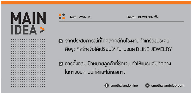 การมีโรงงานเป็นของตัวเองทำให้แบรนด์เครื่องประดับอย่าง BLIKE JEWELRY สร้างความแข็งแกร่งและได้เปรียบผู้เล่นอื่นๆในวงการ อีกทั้งยังเพิ่มอิสระต่อการออกแบบให้ตรงใจทั้งกับตัวดีไซเนอร์เองและกลุ่มเป้าหมายได้อีกด้วย ทั้งนี้ จากการเปิดเผยของ ศิตา ธนโชติกานนท์ เจ้าของแบรนด์ BLIKE JEWELRY เล่าว่า เริ่มทำแบรนด์มาได้ประมาณ 2 ปี เป็นการแตกไลน์ออกมาเป็นแบรนด์เครื่องประดับส่วนตัวเพิ่มจากการที่มีโรงงานรับทำโออีเอ็มของครอบครัวที่อยู่มาถึง 40 ปี