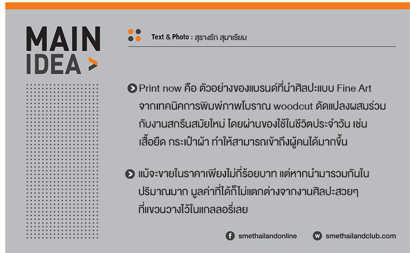 ด้วยความหลงใหลในเสน่ห์ของภาพพิมพ์โบราณดังกล่าว พรยมล สุทธัง (แพงคำ) และ ชญานิษฐ์ ม่วงไทย (ซีเพีย) สองสาวเพื่อนซี้ ศิษย์เก่าคณะจิตรกรรม สาขาภาพพิมพ์ มหาวิทยาลัยศิลปากร จึงได้จับมือกันเปลี่ยนจาการถ่ายทอดบนแผ่นกระดาษมาเป็นผืนผ้า โดยผ่านของใช้ในชีวิตประจำวันอย่างเสื้อยืดหรือกระเป๋า ภายใต้ชื่อแบรนด์ Print now เพื่อให้คนทั่วไปสามารถสัมผัสและรู้จักกับเสน่ห์ของงาน woodcut ได้ง่ายขึ้น ซึ่งไม่เพียงแต่ทำให้ศิลปะกลายเป็นเรื่องใกล้ตัวมากขึ้น แต่ยังสามารถสร้างรายได้ให้กับตนเอง ไม่แพ้งานศิลปะที่ถูกแขวนวางไว้ในแกลลอรี่ แม้จะขายในราคาเพียงหลักร้อยก็ตาม