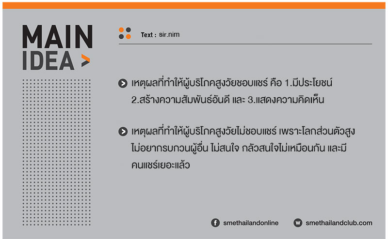 เมื่อได้ทราบเหตุผลของพฤติกรรมการแชร์ หรือไม่แชร์ของผู้สูงอายุแล้ว ผู้ประกอบการ SME ย่อมสามารถนำไปวางแผนสร้างคอนเทนต์ และกลยุทธ์การตลาดที่เหมาะสมกับกลุ่มผู้บริโภคสูงวัยได้อย่างรู้ทิศทางที่ถูกต้อง และแม่นยำมากขึ้นนั่นเอง