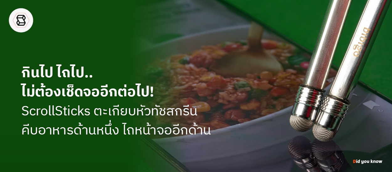 “ScrollSticks” นวัตกรรมสุดล้ำ ที่ออกมาสยบปัญหาคราบซอสบนจอ เพราะนี่คือตะเกียบแบบสองหัว ด้านหนึ่งใช้คีบอาหารเข้าปาก แต่อีกด้านมาพร้อมหัวสัมผัสพิเศษสำหรับหน้าจอทัชสกรีน เพียงแค่พลิกข้อมือเบาๆ ก็สามารถปัด สไลด์ หน้าจอได้ทันที